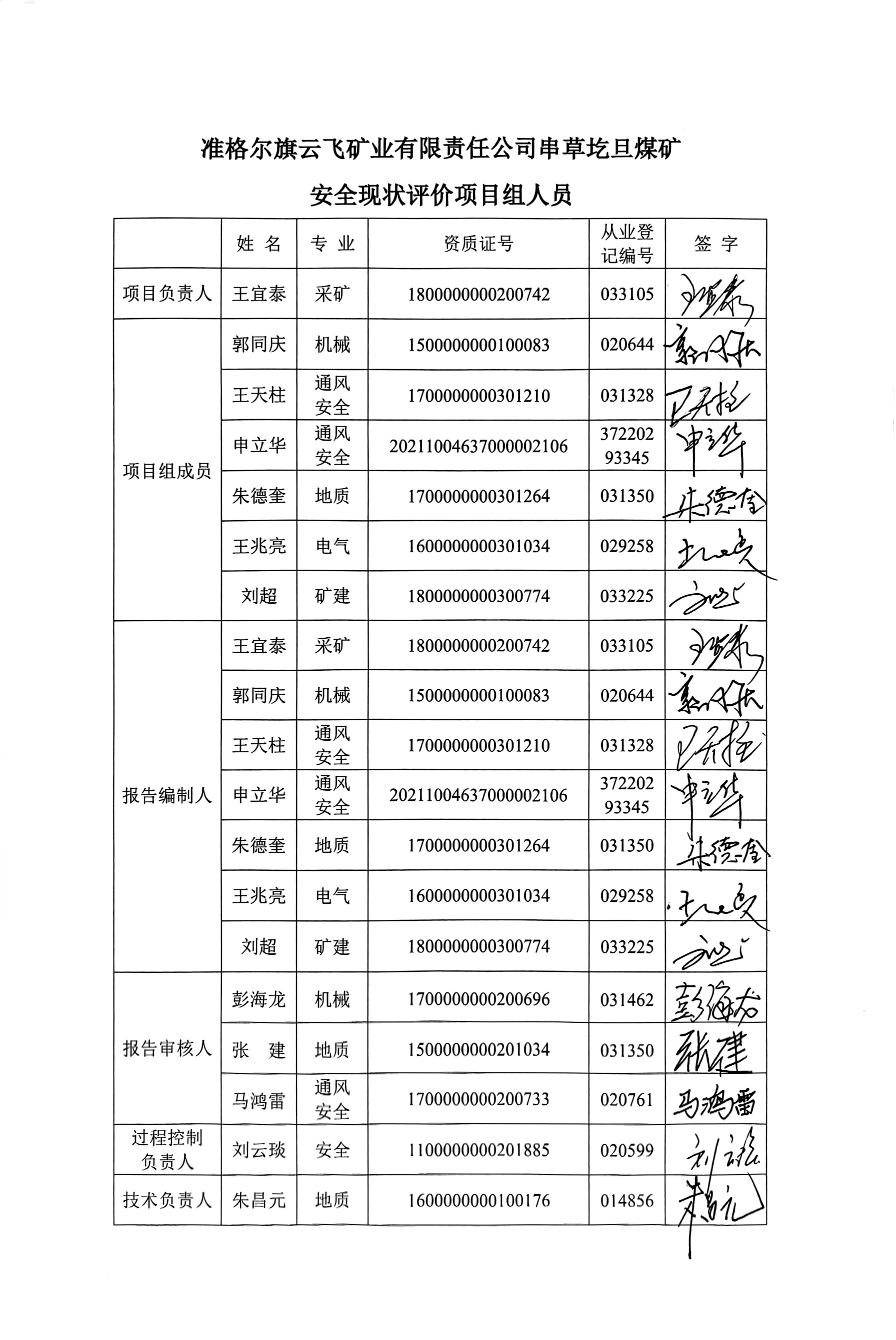 參與安全評價工作的注冊安全工程師: 王宜泰、郭同慶、王天柱、朱德奎、申立華、王兆亮 | ||||||