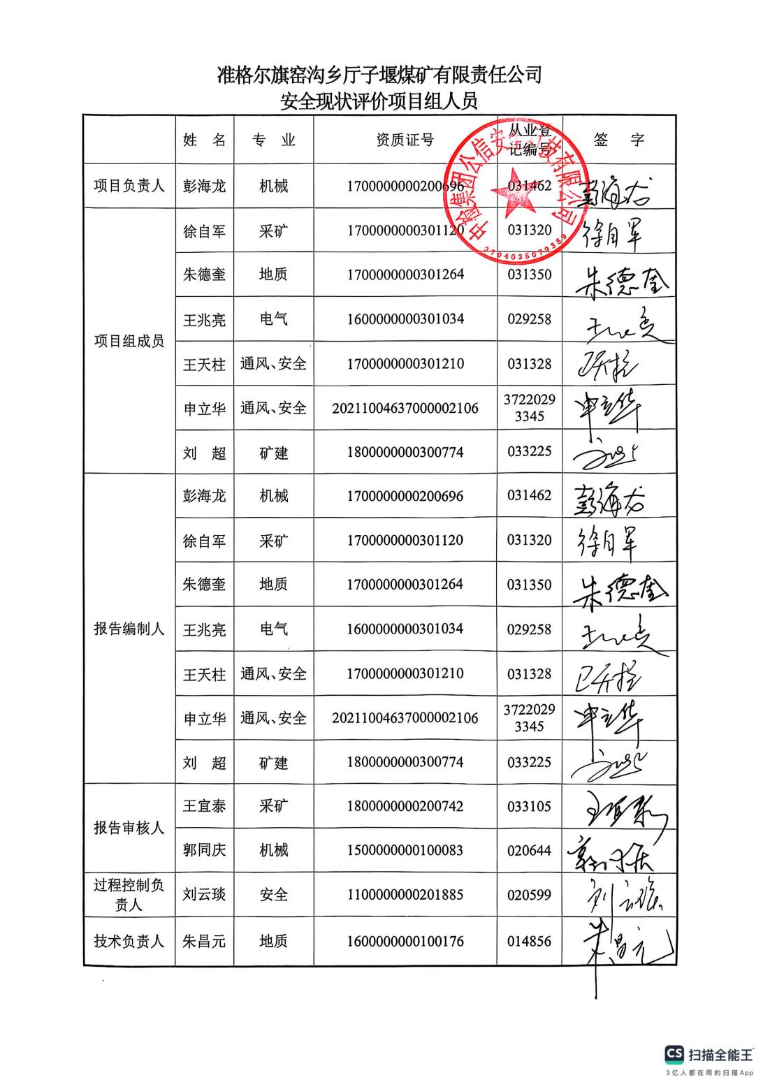 參與安全評(píng)價(jià)工作的注冊(cè)安全工程師: 彭海龍 王天柱 申立華 朱德奎 徐自軍 | |||||||