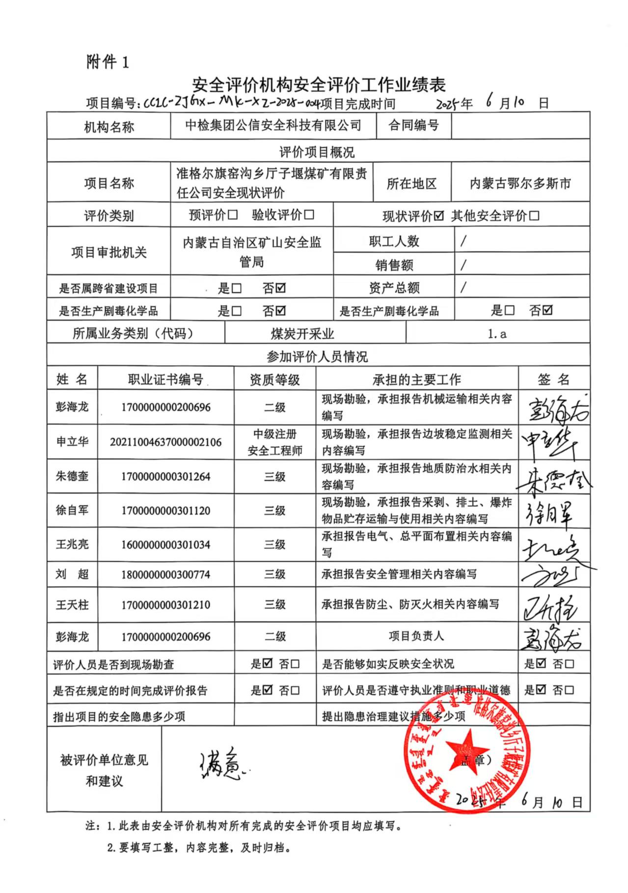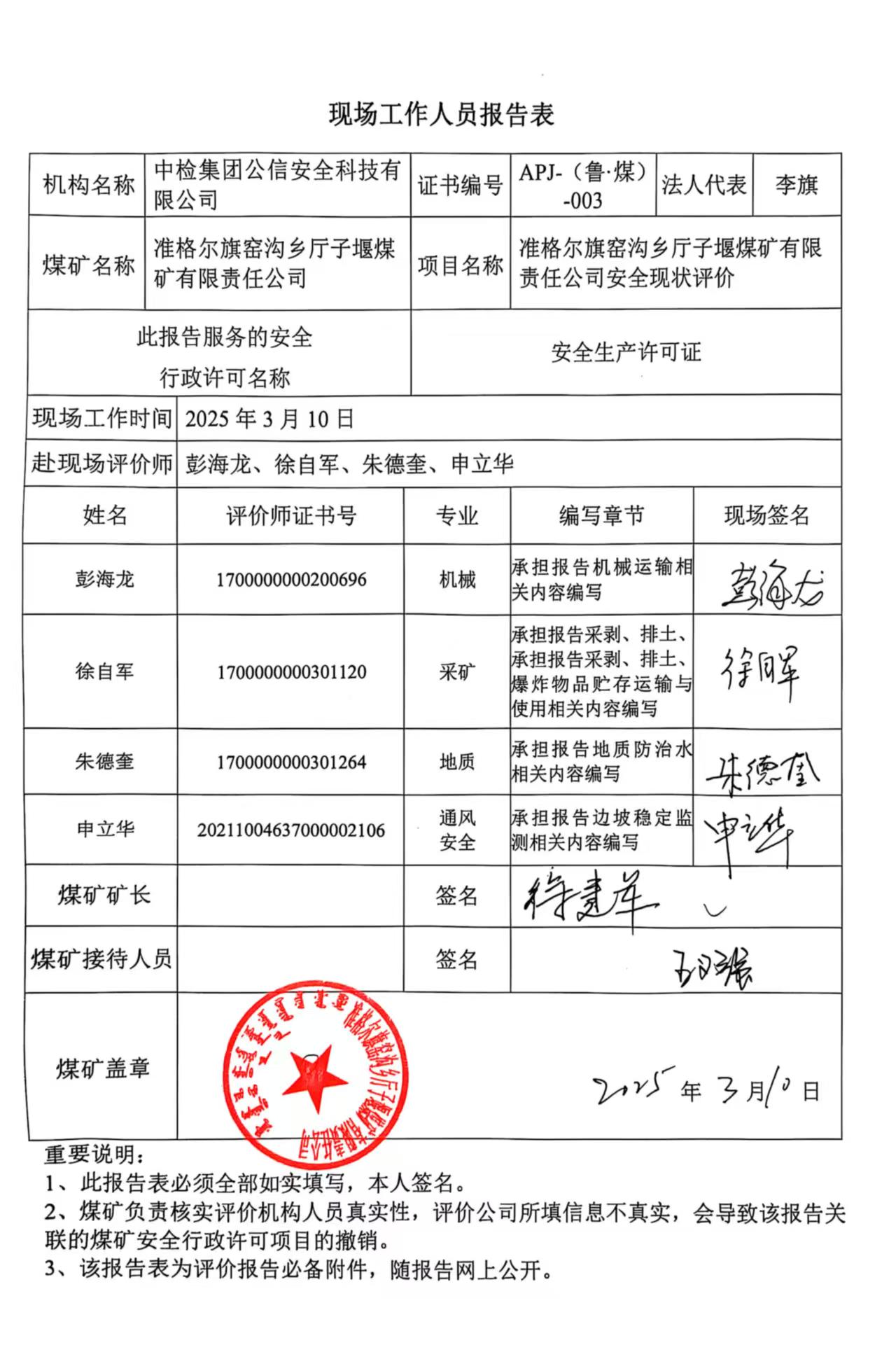 現(xiàn)場(chǎng)開(kāi)展安全評(píng)價(jià)工作的人員、時(shí)間及主要任務(wù): 彭海龍 申立華 朱德奎 徐自軍 于2025年3月10日到現(xiàn)場(chǎng)進(jìn)行調(diào)查、搜集資料,進(jìn)行現(xiàn)場(chǎng)評(píng)價(jià)。 彭海龍 徐自軍 朱德奎于2025年5月14日對(duì)現(xiàn)場(chǎng)問(wèn)題進(jìn)行復(fù)查,礦方均已整改合格。 彭海龍 王天柱 申立華 朱德奎 徐自軍 王兆亮 劉超 對(duì)報(bào)告進(jìn)行了編寫。 | |||||||