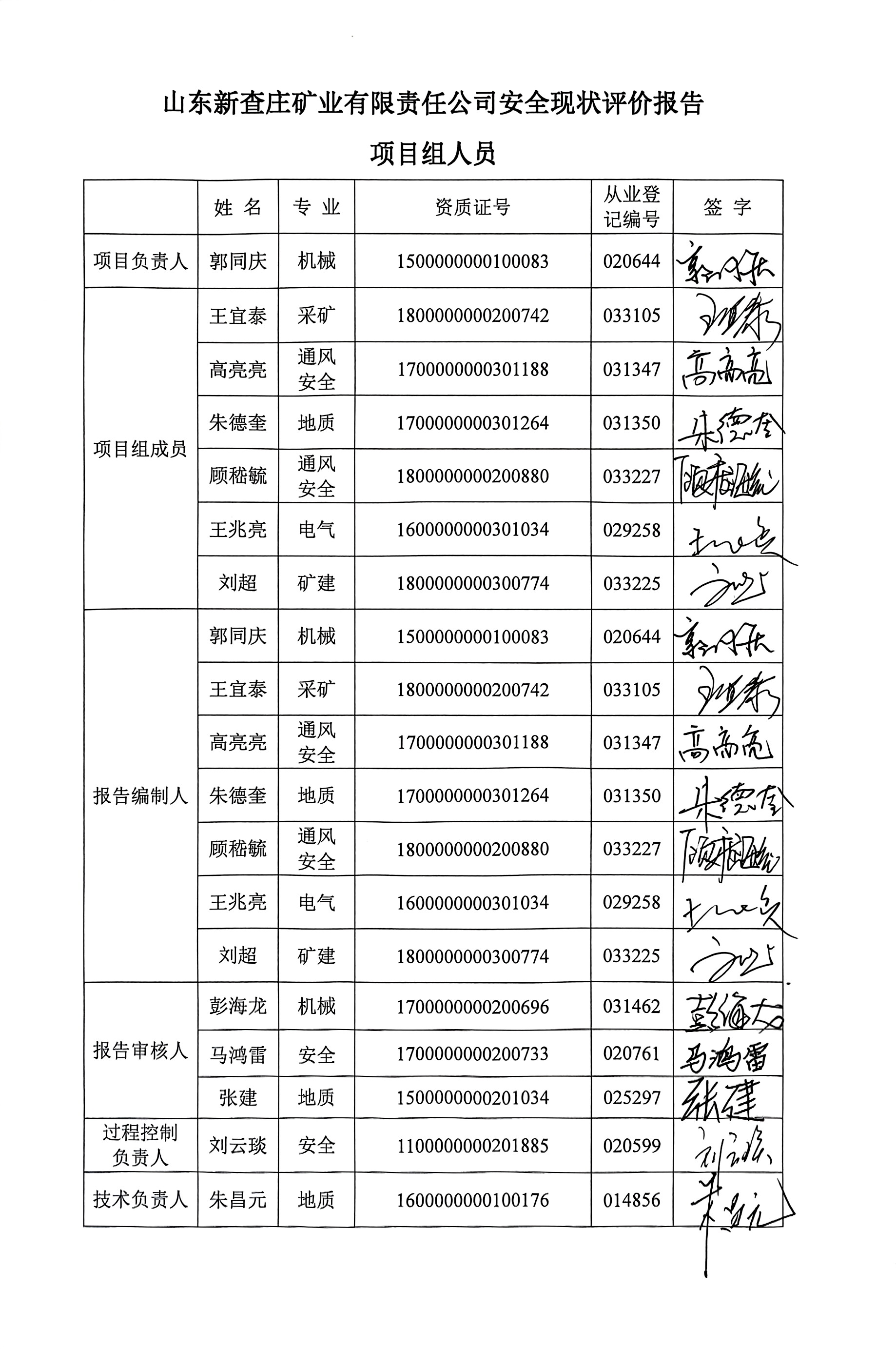參與安全評(píng)價(jià)工作的注冊(cè)安全工程師: 郭同慶、王宜泰、高亮亮、朱德奎、顧嵇毓、王兆亮 | ||||||