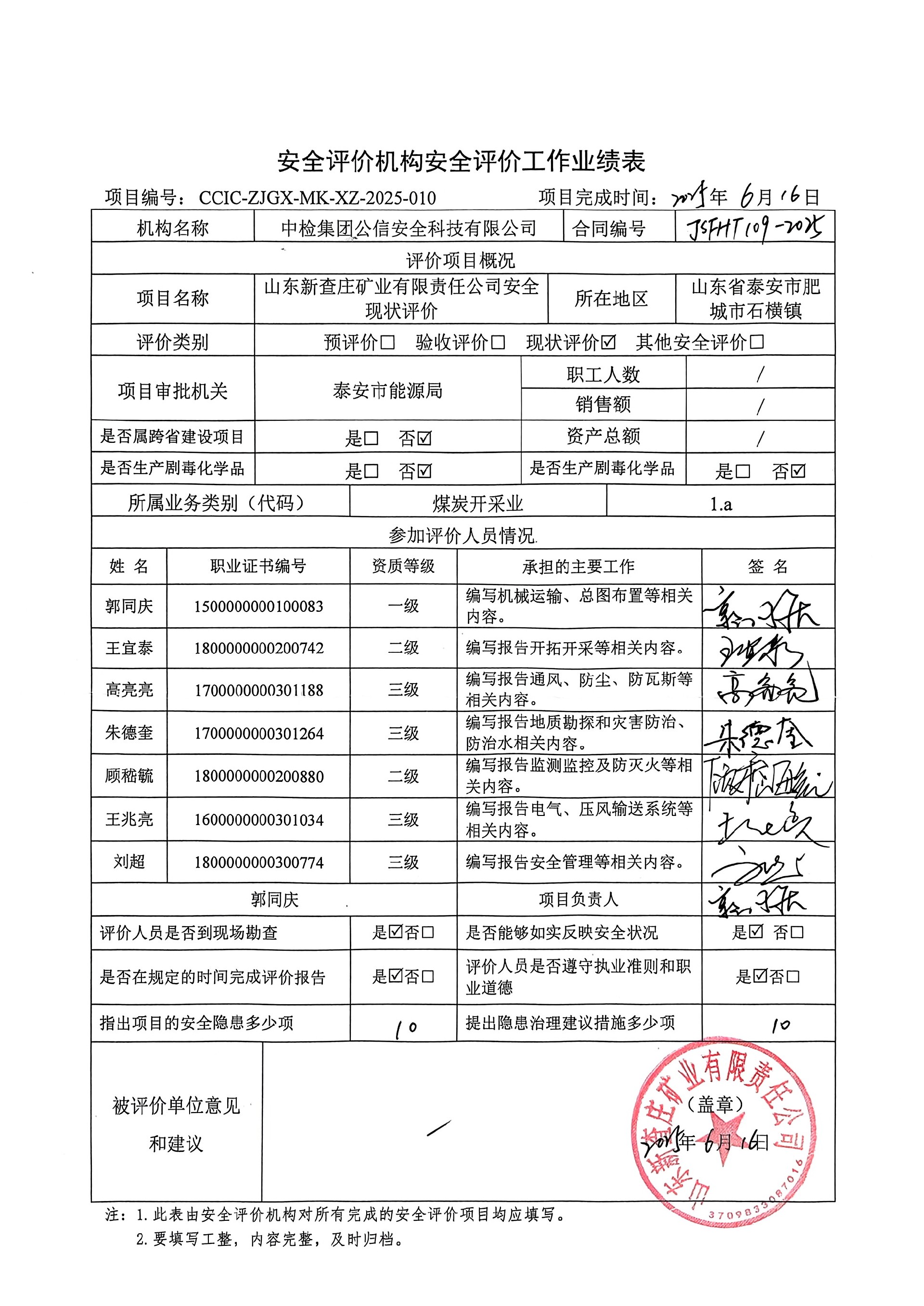 評(píng)價(jià)項(xiàng)目名稱 | 山東新查莊礦業(yè)有限責(zé)任公司安全現(xiàn)狀評(píng)價(jià)報(bào)告 | |||||