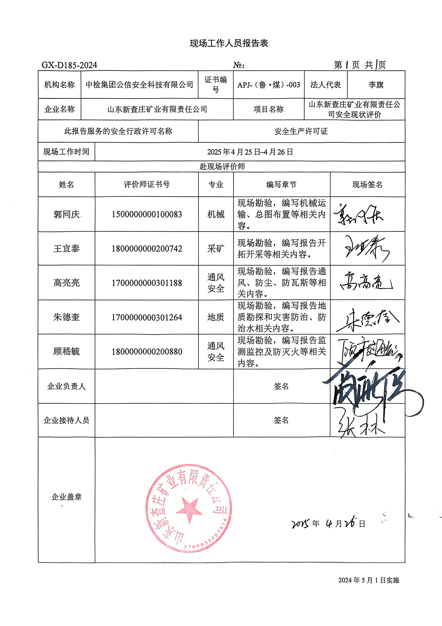 到現(xiàn)場(chǎng)開(kāi)展安全評(píng)價(jià)工作的人員、時(shí)間及主要任務(wù): 人員:王宜泰、郭同慶、高亮亮、顧嵇毓、朱德奎 時(shí)間、任務(wù): 評(píng)價(jià)項(xiàng)目組于2025年4月25日~26日到現(xiàn)場(chǎng)調(diào)查、檢查;2025年5月17日編寫(xiě)修改完善報(bào)告。 | ||||||