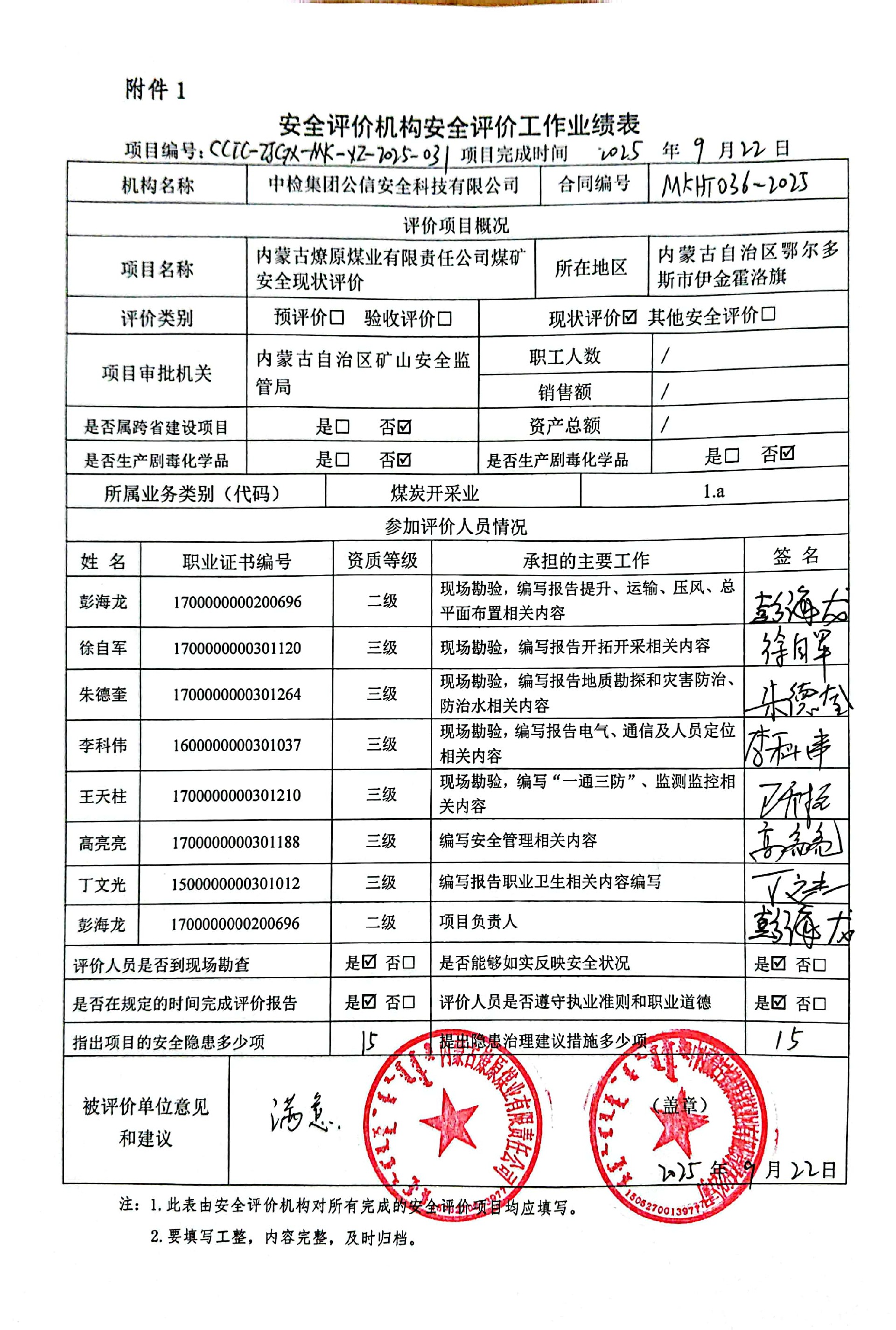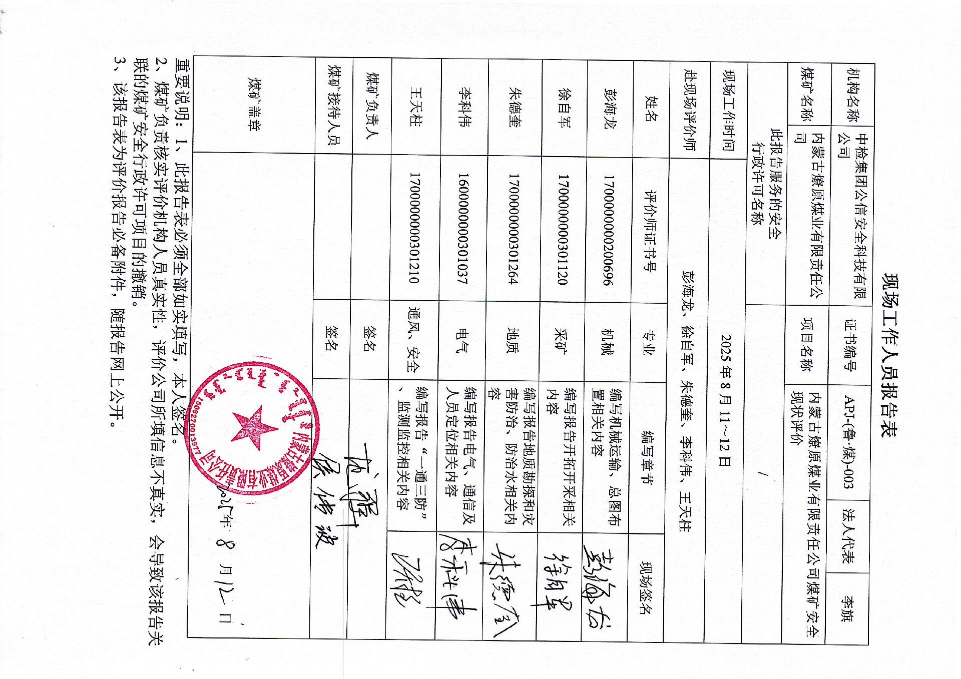 現(xiàn)場開展安全評價(jià)工作的人員、時間及主要任務(wù): 彭海龍、李科偉、徐自軍、朱德奎、王天柱于2025年8月11日~12日到現(xiàn)場進(jìn)行調(diào)查、搜集資料,進(jìn)行現(xiàn)場評價(jià)。于2025年8月17日到現(xiàn)場評價(jià)時存在的問題進(jìn)行了復(fù)查。 | |||||||