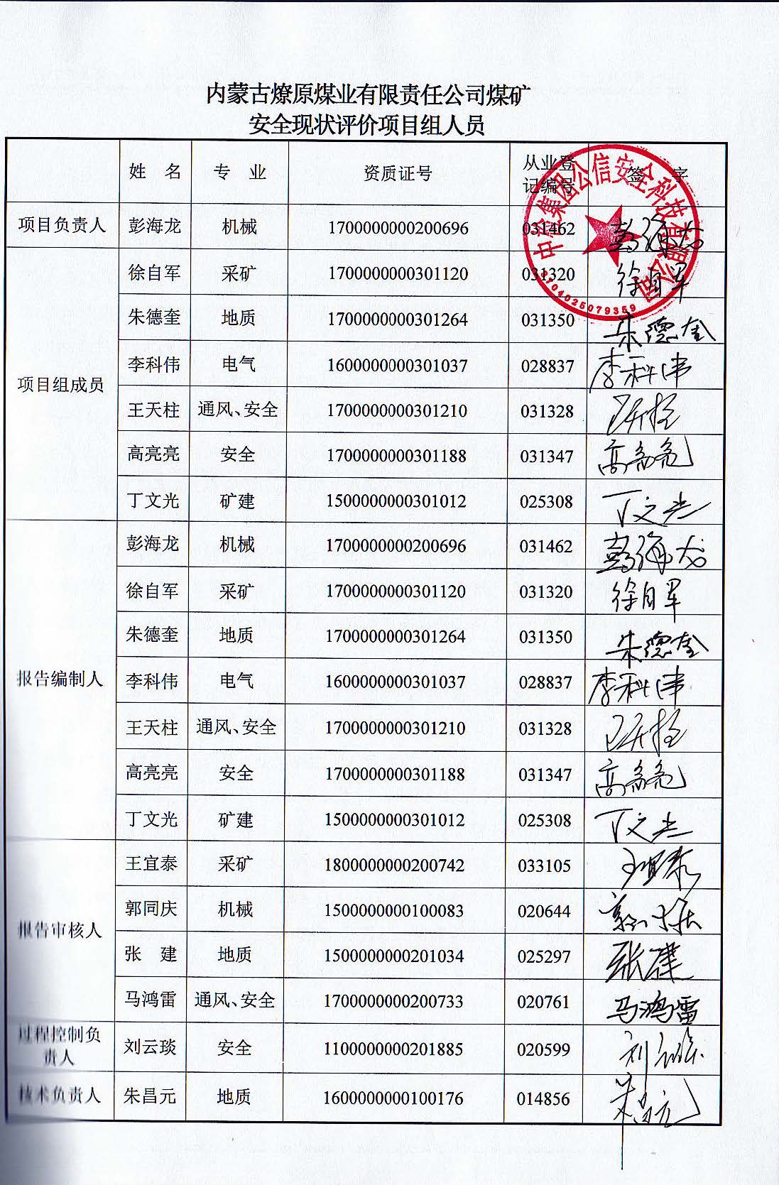 參與安全評價(jià)工作的安全評價(jià)師: 彭海龍 李科偉 徐自軍 朱德奎 王天柱 高亮亮 丁文光 | |||||||