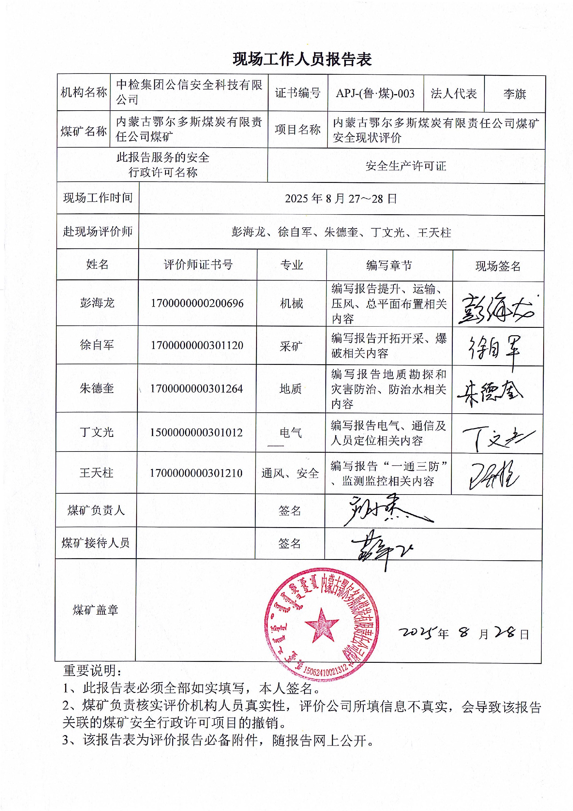 現(xiàn)場開展安全評價工作的人員、時間及主要任務(wù): 彭海龍、徐自軍、朱德奎、丁文光、王天柱 于2025年8月27日~28日到現(xiàn)場進行調(diào)查、搜集資料,進行現(xiàn)場評價。 于2025年8月30日到現(xiàn)場評價時存在的問題進行了復(fù)查。 | |||||||