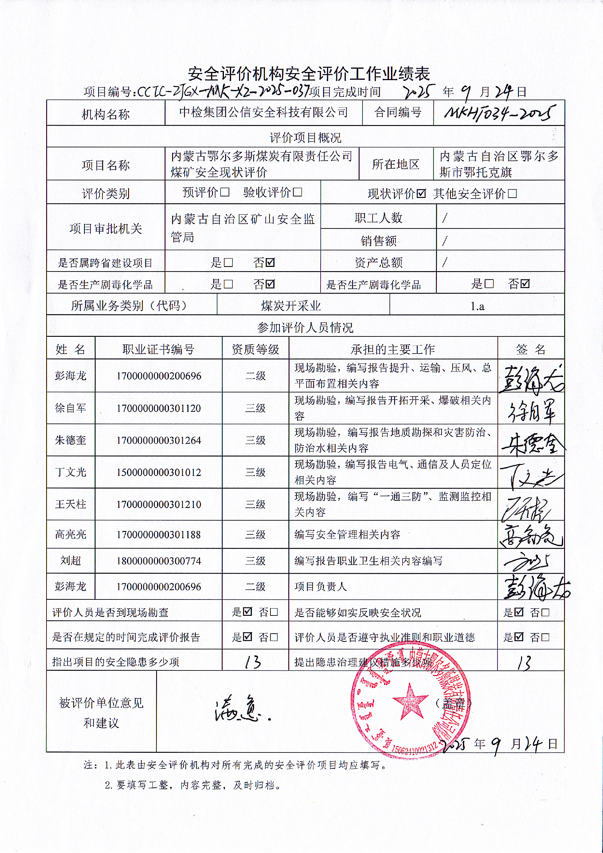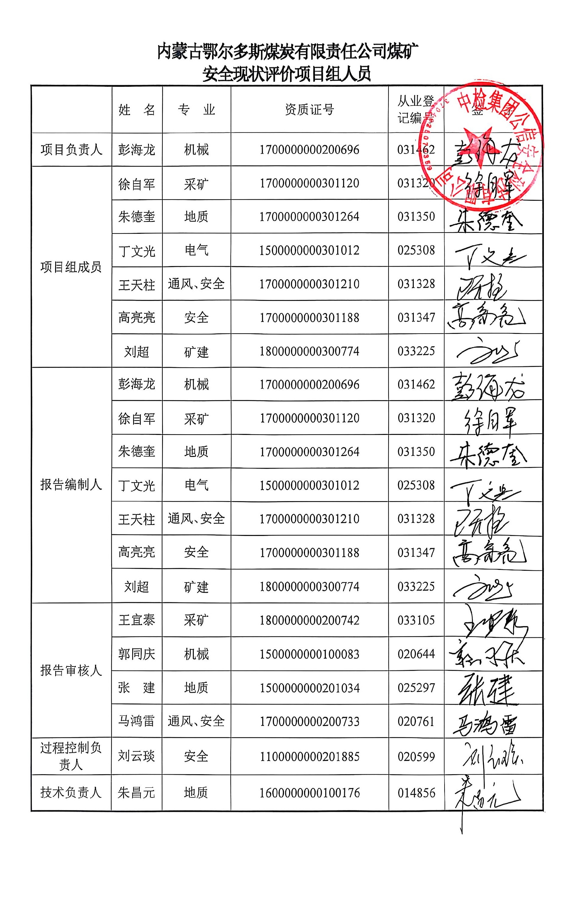 參與安全評價工作的安全評價師: 彭海龍、徐自軍、朱德奎、丁文光、王天柱、高亮亮、劉超 | |||||||