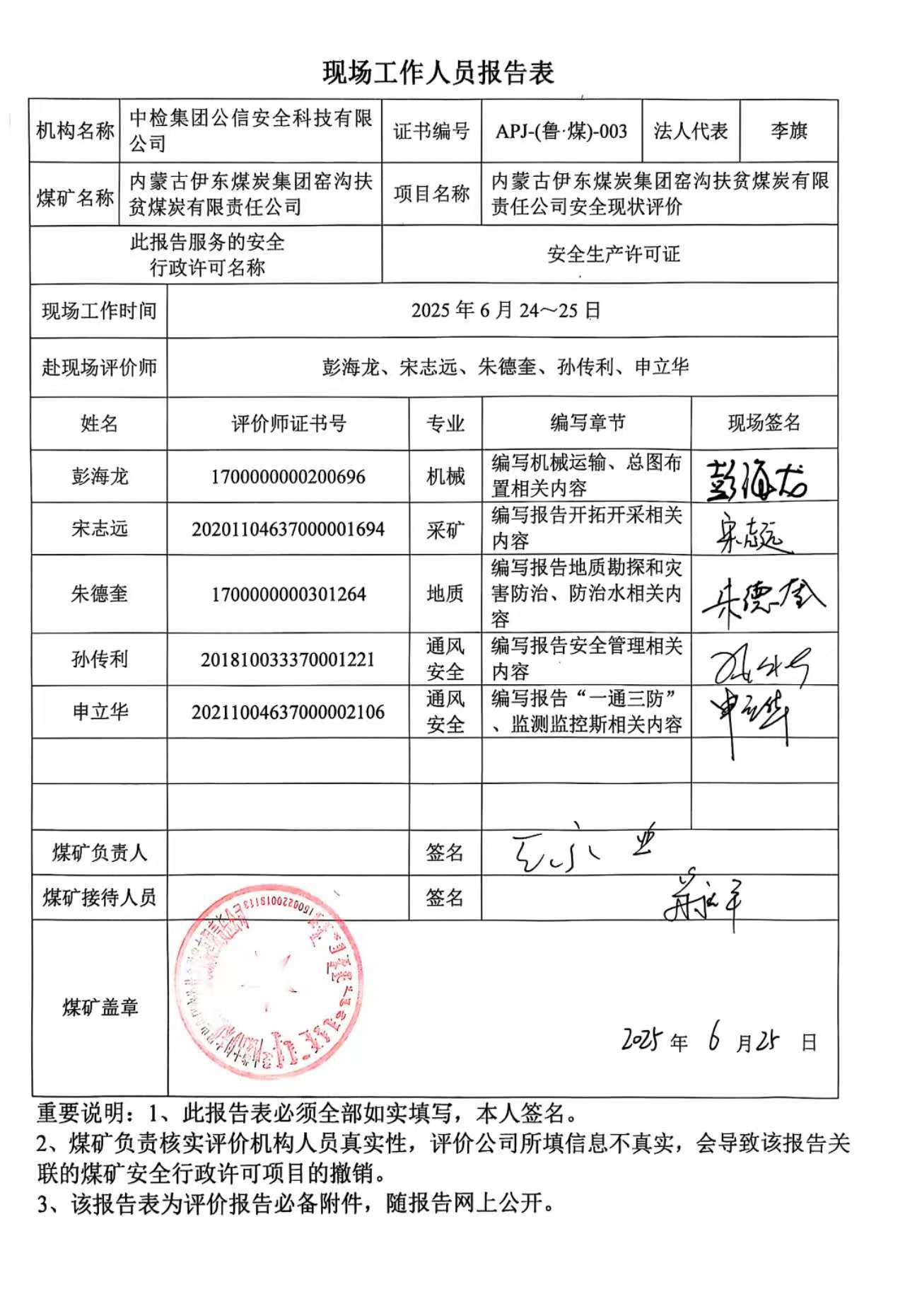 現(xiàn)場開展安全評價工作的人員、時間及主要任務(wù): 彭海龍 孫傳利 申立華 朱德奎 宋志遠(yuǎn)于2025年6月24日~25日到現(xiàn)場進行調(diào)查、搜集資料,進行現(xiàn)場評價。 彭海龍 申立華 朱德奎于2025年6月15~27日對現(xiàn)場問題進行復(fù)查,礦方均已整改合格。 彭海龍 孫傳利 申立華 朱德奎 宋志遠(yuǎn) 王兆亮 劉超 對報告進行了編寫。 | |||||||