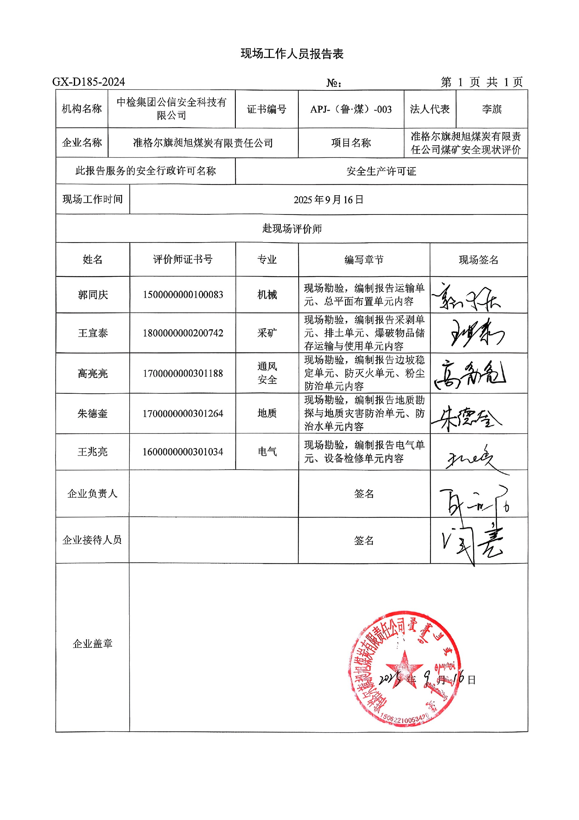 現(xiàn)場開展安全評價工作的人員、時間及主要任務(wù): 郭同慶、王宜泰、高亮亮、王兆亮、朱德奎2025年9月16日到現(xiàn)場進行調(diào)查、搜集資料,進行現(xiàn)場評價。 | |||||||