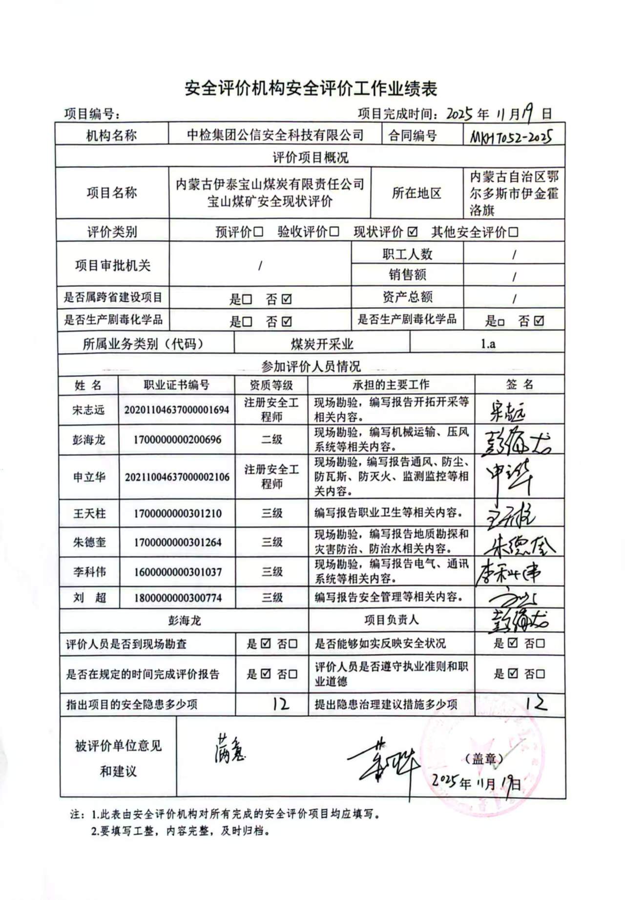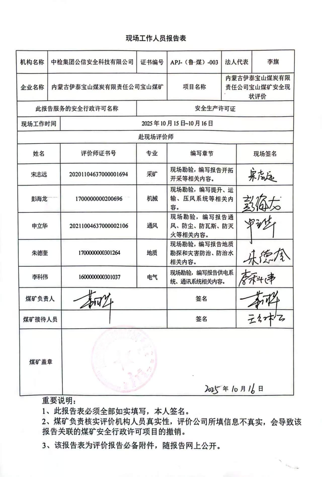 現(xiàn)場(chǎng)開展安全評(píng)價(jià)工作的人員、時(shí)間及主要任務(wù): 彭海龍 李科偉 申立華 朱德奎 宋志遠(yuǎn)于2025年10月15日~16日到現(xiàn)場(chǎng)進(jìn)行調(diào)查、搜集資料,進(jìn)行現(xiàn)場(chǎng)評(píng)價(jià)。 彭海龍 宋志遠(yuǎn)于2025年10月18日對(duì)現(xiàn)場(chǎng)問題進(jìn)行復(fù)查,礦方均已整改合格。 彭海龍 王天柱 申立華 朱德奎 宋志遠(yuǎn) 李科偉 劉超 對(duì)報(bào)告進(jìn)行了編寫。 | |||||||