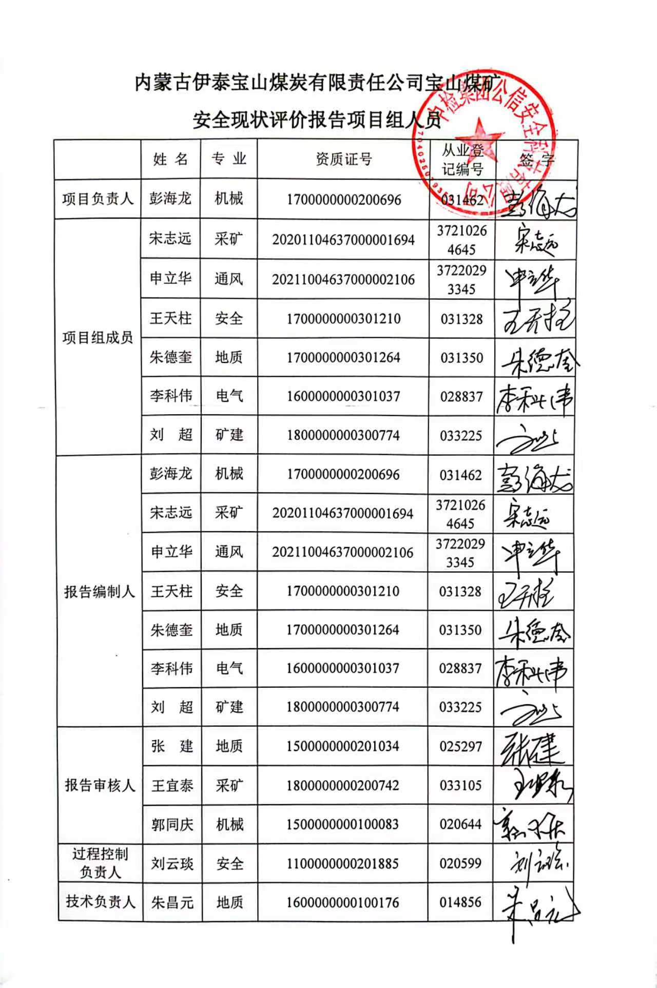 參與安全評(píng)價(jià)工作的安全評(píng)價(jià)師: 彭海龍 王天柱 朱德奎 李科偉 劉超 | |||||||