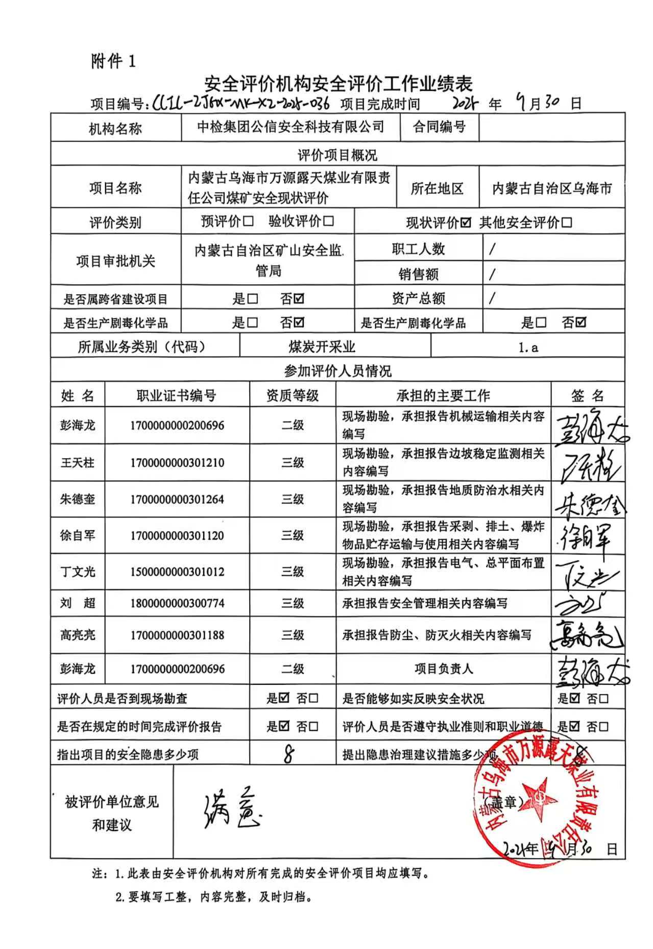 評價項目名稱 | 內(nèi)蒙古烏海市萬源露天煤業(yè)有限責任公司煤礦安全現(xiàn)狀評價報告 | ||||||