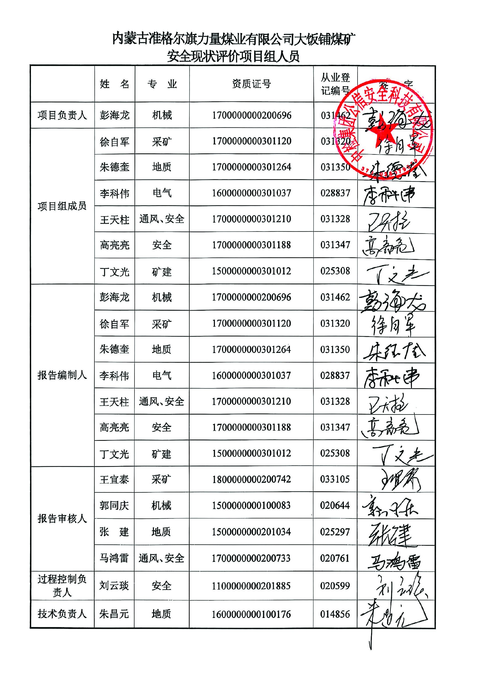 參與安全評(píng)價(jià)工作的注冊(cè)安全工程師: 彭海龍 李科偉、徐自軍 朱德奎 王天柱 高亮亮 丁文光 | |||||||