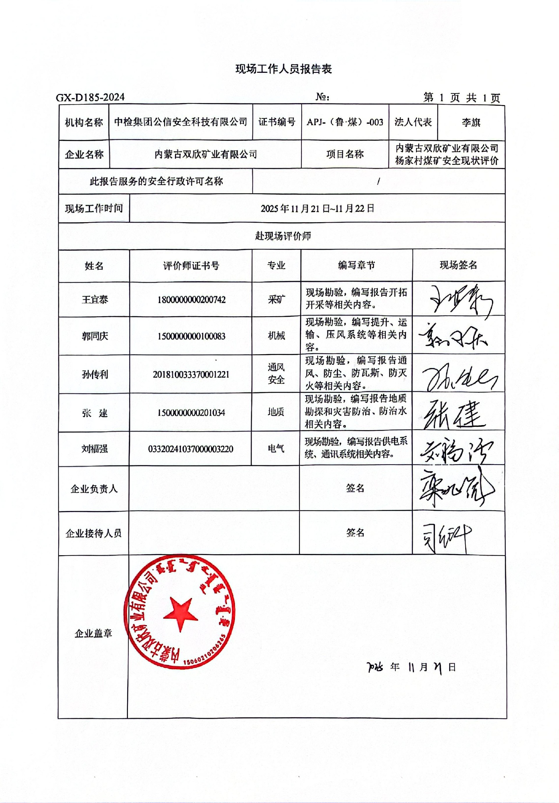 到現(xiàn)場(chǎng)開(kāi)展安全評(píng)價(jià)工作的人員、時(shí)間及主要任務(wù): 人員:王宜泰、郭同慶、張建、馬鴻雷、孫傳利 時(shí)間、任務(wù):評(píng)價(jià)項(xiàng)目組于2025年11月21日~22日到現(xiàn)場(chǎng)調(diào)查、檢查;2025年11月27日編寫(xiě)修改完善報(bào)告。 | ||||||