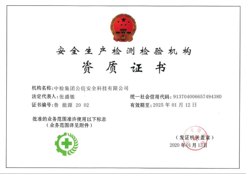 機構名稱:中檢集團公信安全科技有限公司證書編號:魯 能源 20 02有效期至:2030年1月12日