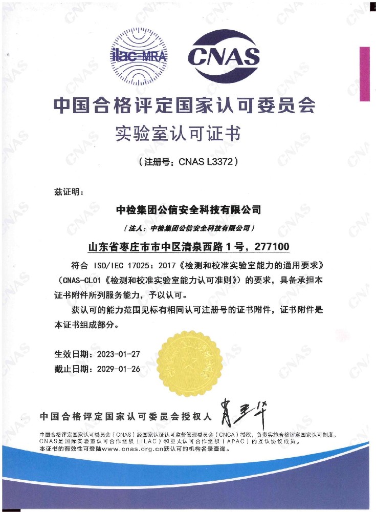 機構名稱:中檢集團公信安全科技有限公司注冊號:CNAS L3372有效期至:2029年01月26日