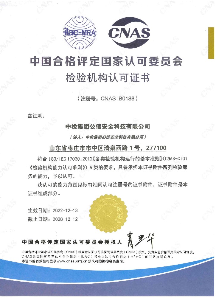 機構名稱:中檢集團公信安全科技有限公司注冊號:CNAS IB0188有效期至:2028年12月12日