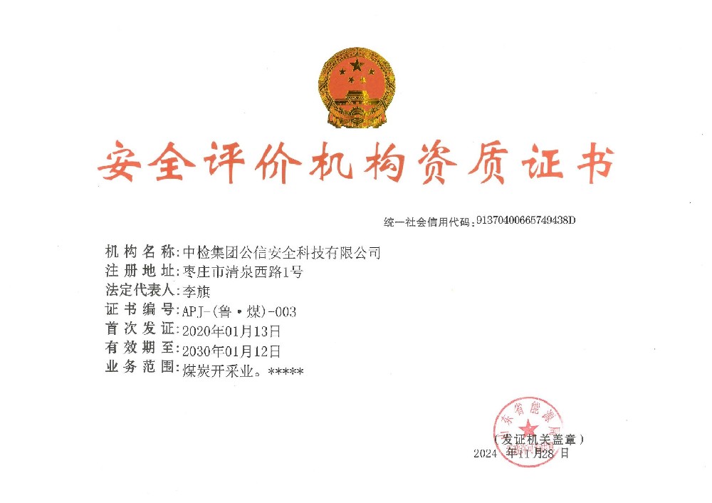 機構名稱:中檢集團公信安全科技有限公司證書編號:APJ-(魯·煤)-003有效期至:2030年1月12日