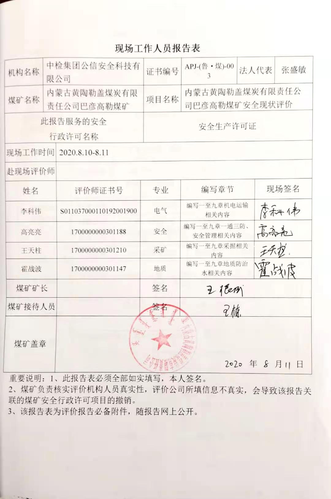 安全評(píng)價(jià)報(bào)告網(wǎng)上公開信息表 季度: 四季度 評(píng)價(jià)項(xiàng)目名稱 內(nèi)蒙古黃陶勒蓋煤炭有限責(zé)任公司巴彥高勒煤