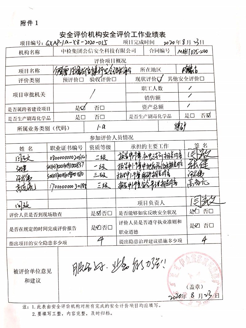 | 現(xiàn)場(chǎng)開展安全評(píng)價(jià)工作的人員、時(shí)間及主要任務(wù): 張 建 閆運(yùn)文 許光偉 高亮亮 于2020年7月9日到現(xiàn)場(chǎng)進(jìn)行調(diào)查、搜集資料,進(jìn)行現(xiàn)場(chǎng)評(píng)價(jià)。 于2020年8月2日到現(xiàn)場(chǎng)對(duì)評(píng)價(jià)時(shí)存在的問題進(jìn)行了復(fù)查。 |