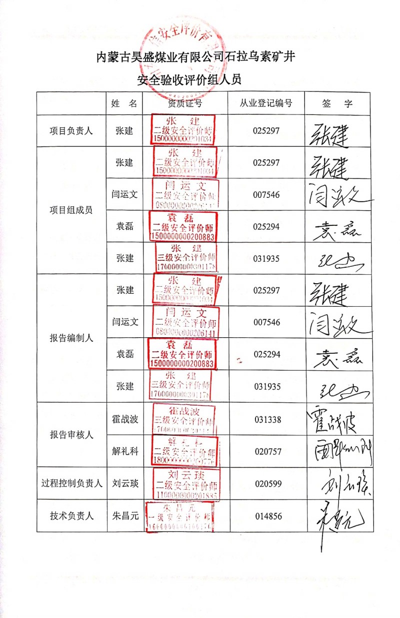 | 參與安全評(píng)價(jià)工作的安全評(píng)價(jià)師: 張 建 閆運(yùn)文 袁 磊 張 建 |