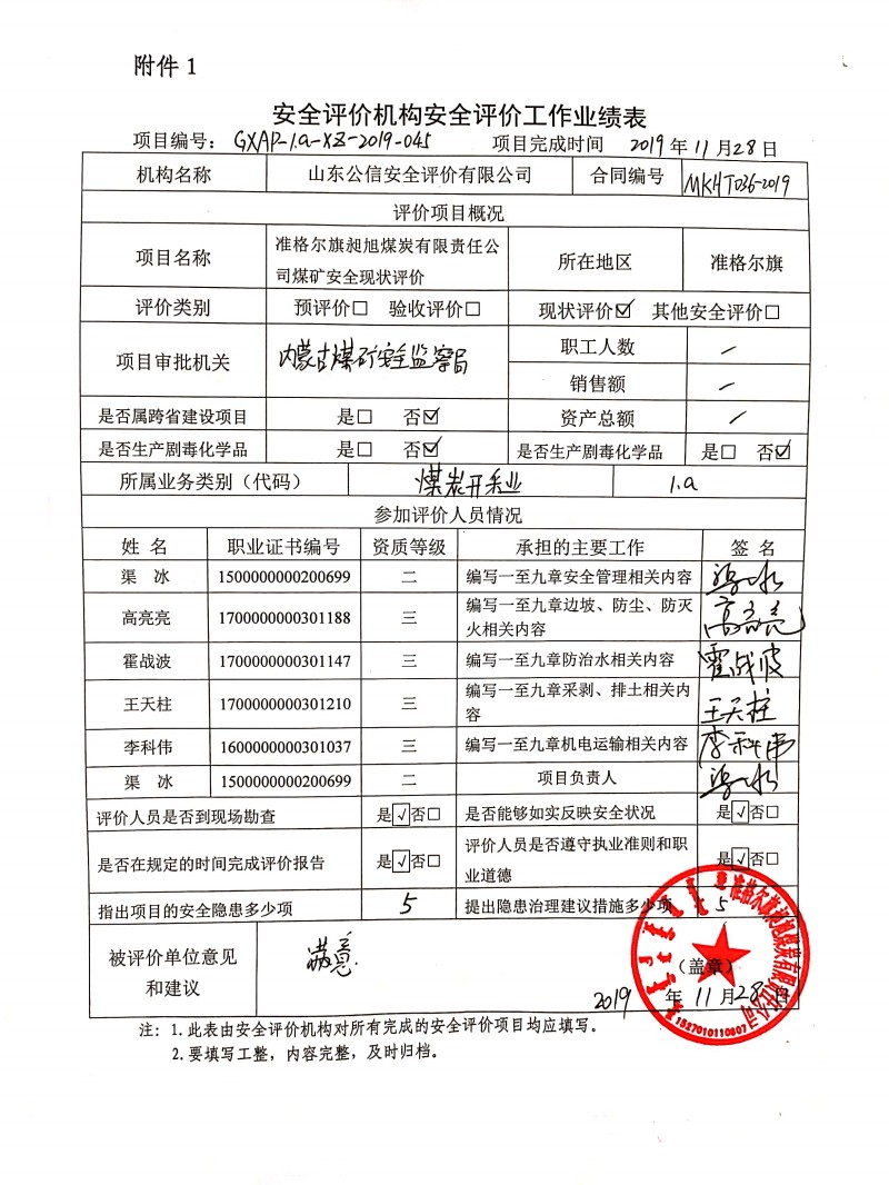 | 到現(xiàn)場(chǎng)開展安全評(píng)價(jià)工作的人員、時(shí)間及主要任務(wù): 人員:渠冰、李科偉、高亮亮、霍戰(zhàn)波、王天柱 時(shí)間、任務(wù): 2019年9月10日現(xiàn)場(chǎng)調(diào)查;2019年10月13日復(fù)查;2019年10月14日至2019年11月12日編寫修改完善報(bào)告。 |