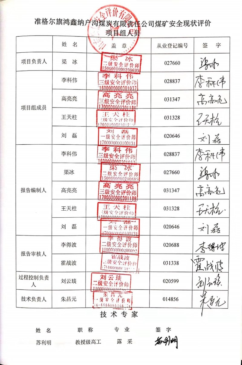 | 參與安全評(píng)價(jià)工作的注冊(cè)安全工程師: 渠冰、劉磊、高亮亮 |