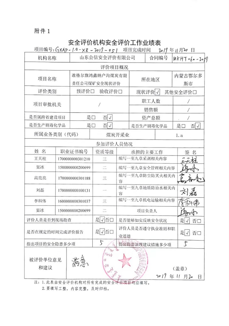 | 到現(xiàn)場(chǎng)開(kāi)展安全評(píng)價(jià)工作的人員、時(shí)間及主要任務(wù): 人員:高亮亮、渠冰、王天柱、李科偉、劉磊 時(shí)間、任務(wù): 2019年11月4日現(xiàn)場(chǎng)調(diào)查;2019年11月6日復(fù)查;2019年11月5日至2019年11月14日編寫(xiě)修改完善報(bào)告。 |