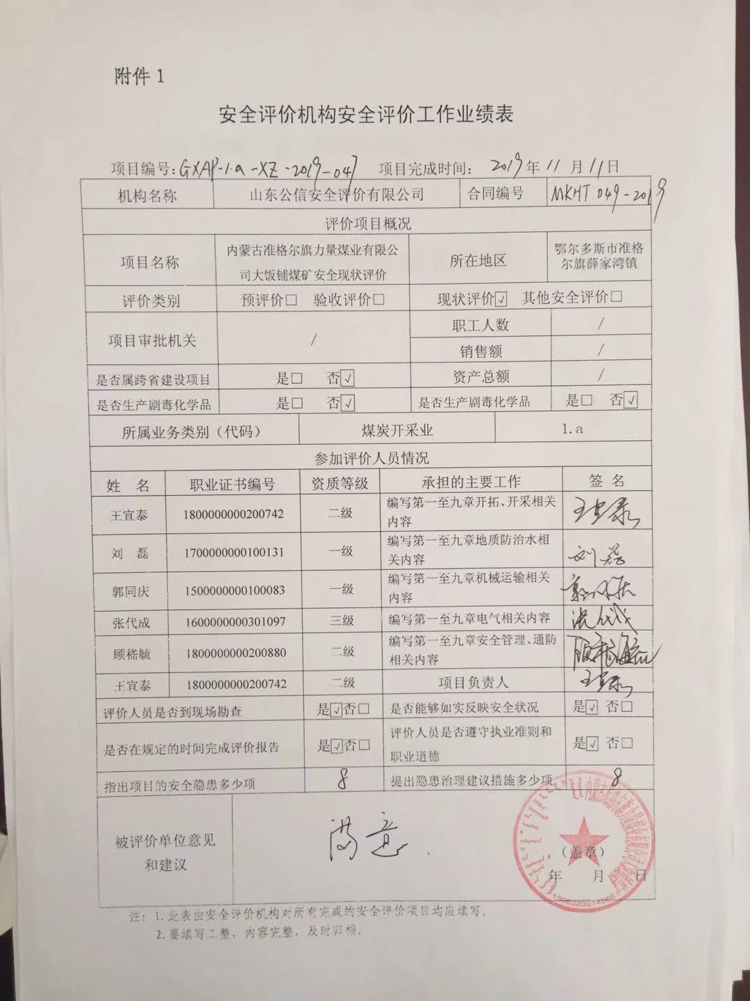 | 評價項目名稱 | 內(nèi)蒙古準(zhǔn)格爾旗力量煤業(yè)有限公司大飯鋪煤礦安全現(xiàn)狀評價報告 | ||||||