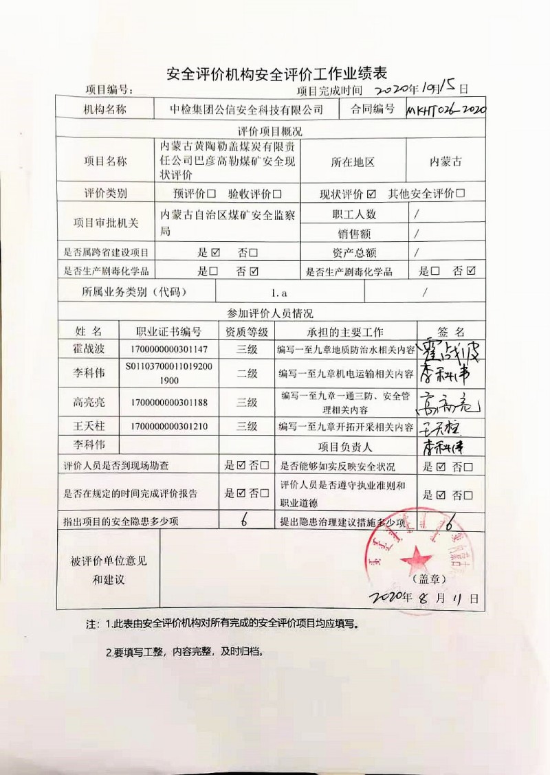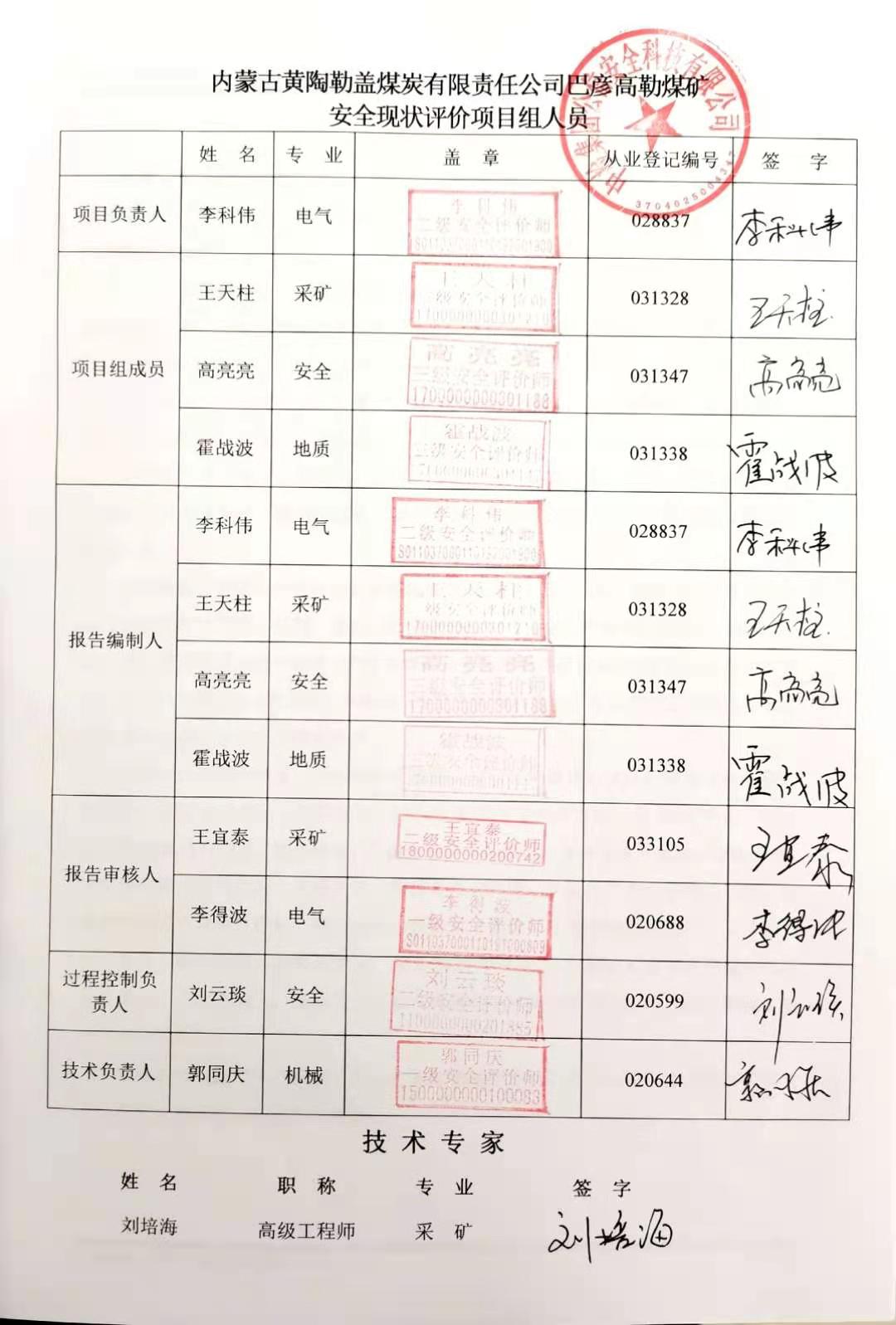 | 評價項目名稱 | 內(nèi)蒙古黃陶勒蓋煤炭有限責(zé)任公司 巴彥高勒煤礦安全現(xiàn)狀評價報告 |