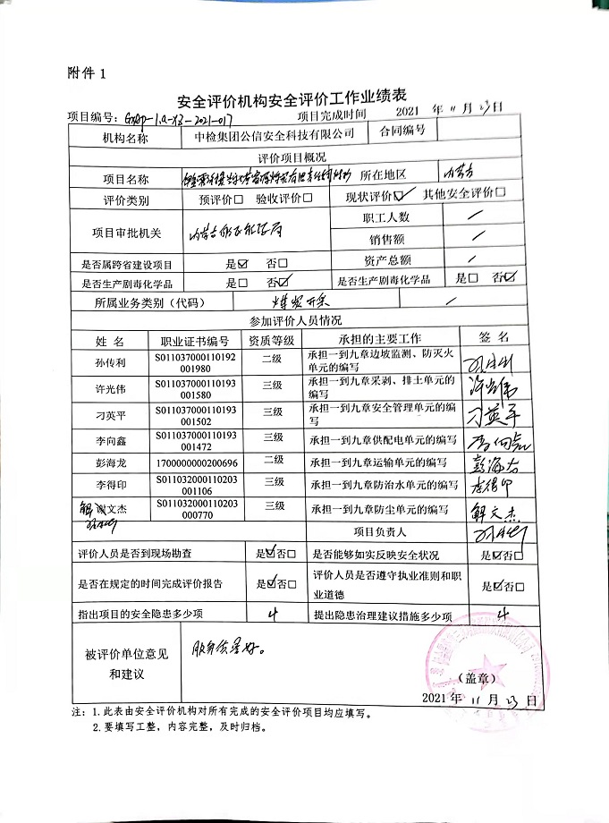 | 現(xiàn)場(chǎng)開(kāi)展安全評(píng)價(jià)工作的人員、時(shí)間及主要任務(wù): 孫傳利、彭海龍、李得印、刁英平、許光偉、解文杰、李向鑫于2021年11月9日到現(xiàn)場(chǎng)進(jìn)行調(diào)查、搜集資料,進(jìn)行現(xiàn)場(chǎng)評(píng)價(jià)。 |
