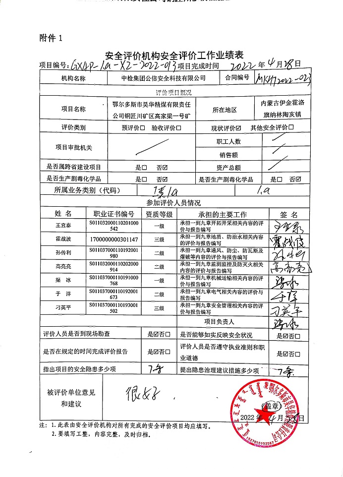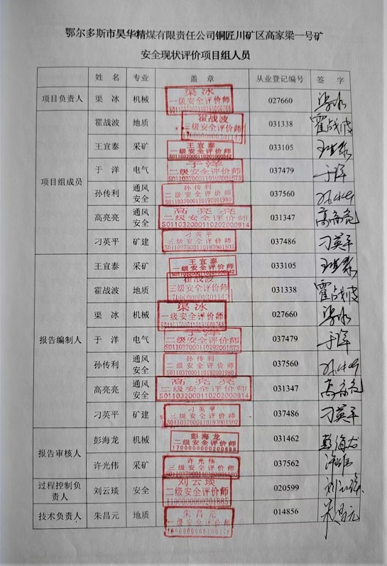 | 評價項目名稱 | 鄂爾多斯市昊華精煤有限責任公司銅匠川礦區(qū)高家梁一號礦安全現(xiàn)狀評價報告 | ||||||