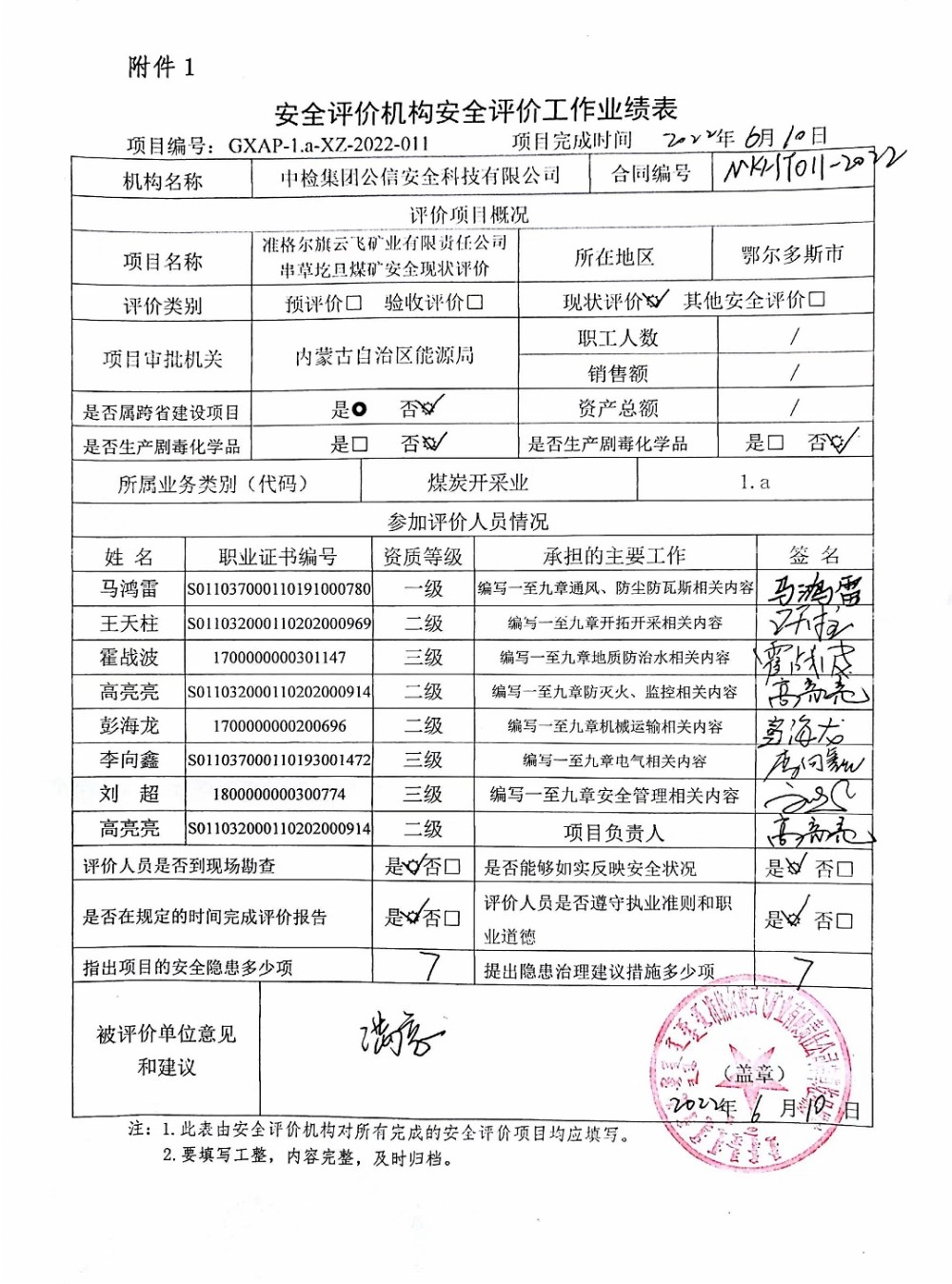 | 現(xiàn)場(chǎng)開展安全評(píng)價(jià)工作的人員、時(shí)間及主要任務(wù): 高亮亮 王天柱 馬鴻雷 霍戰(zhàn)波 彭海龍 李向鑫 劉超 于2022年3月16~17日到現(xiàn)場(chǎng)進(jìn)行調(diào)查、搜集資料,進(jìn)行現(xiàn)場(chǎng)評(píng)價(jià)。 于2022年5月1日到現(xiàn)場(chǎng)評(píng)價(jià)時(shí)存在的問(wèn)題進(jìn)行了復(fù)查。 |